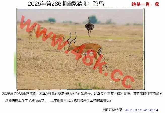 (1)2025年第286期幽默猜测(鸵鸟):羚羊在草原慢悠悠的在散看步,鸵鸟又在草原上横冲直撞,而且眼睛还不看前方,这都快撞上羚羊了还没察觉。..本期图片会给我们带来什么样的玄机呢?